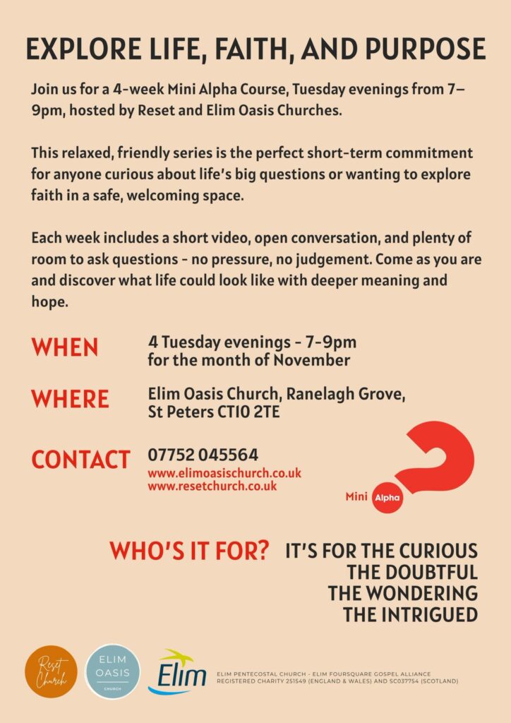 We are running a mini Alpha Course in Autumn 2025, offering a space to ask life’s big questions in a friendly, open environment.